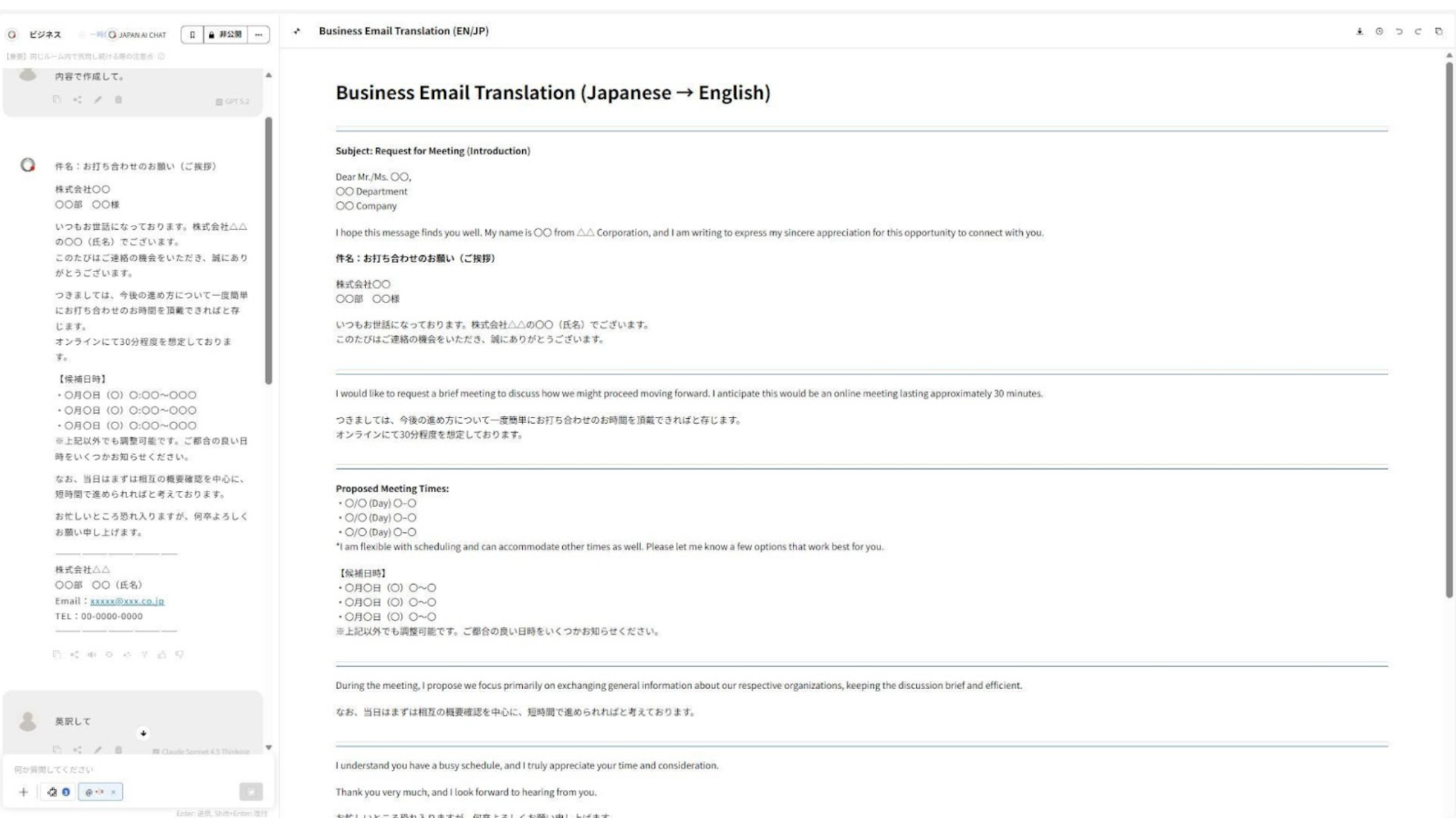 翻訳ツールとの違いで実感が大きいのは、こちらが付加情報を渡すと、前提を踏まえて言い回しを整えてくれる点です。意訳もできますし、「もう少し短く」「要点だけにまとめて」といった分量調整も効く。直訳中心の翻訳ツールだと難しかったところが、業務上は一番助かっています。