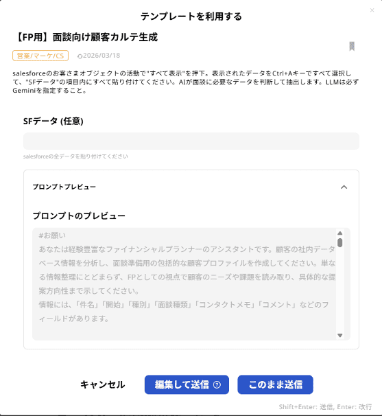 ひとつは、同じ音声に対して”面談の型”ごとのプロンプトを当てる使い方です。初回面談、紹介をもらうための面談など、目的に合わせて要約の切り口を変える。面談の内容は同じでも、「次に何をするか」に直結するアウトプットが変わります。