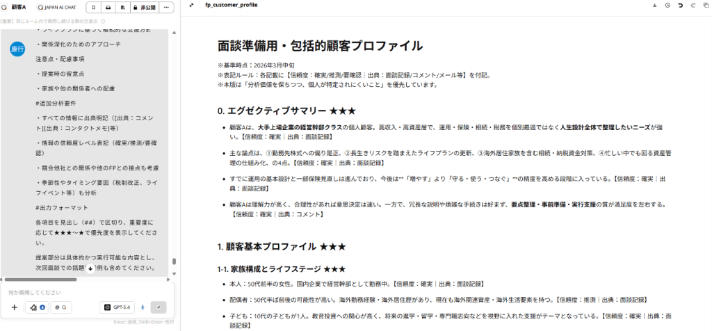 実際にGAIAのFPが使用している面談向け顧客カルテの生成画面。詳細なプロンプトが記入されている