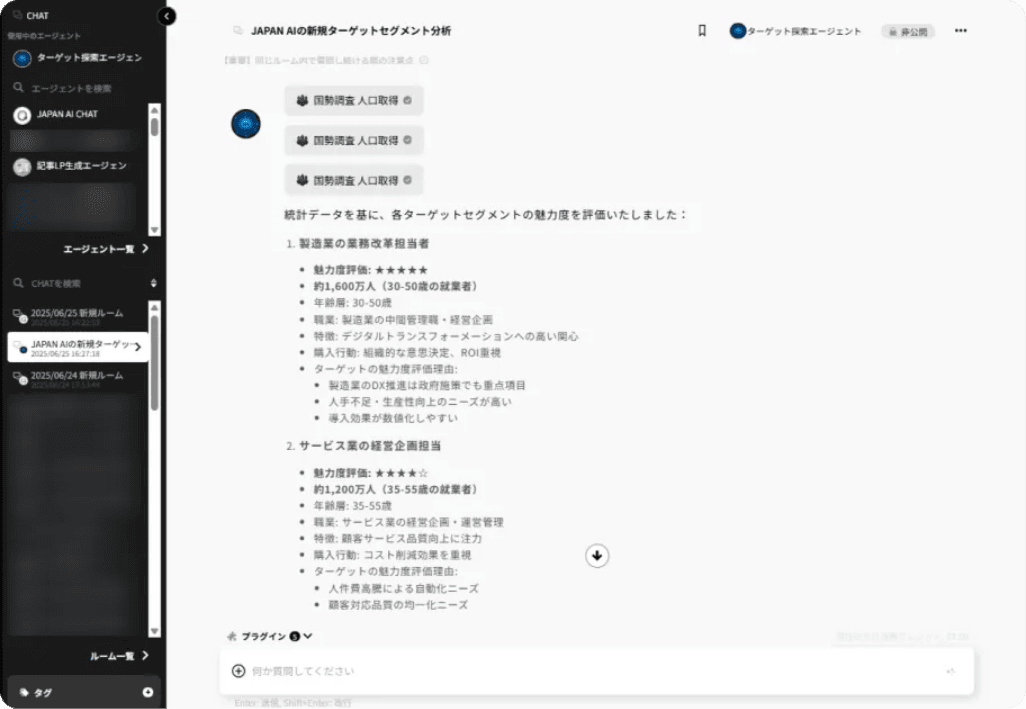 商品やサービスの情報を入れるだけで、最適な顧客層を瞬時に見つけ出すビジネス分析ツールです。気になるターゲットを選ぶと、その層の特徴や消費傾向まで詳しく分析。今後は実際の市場データも活用し、より精度の高いマーケット分析が可能になります。