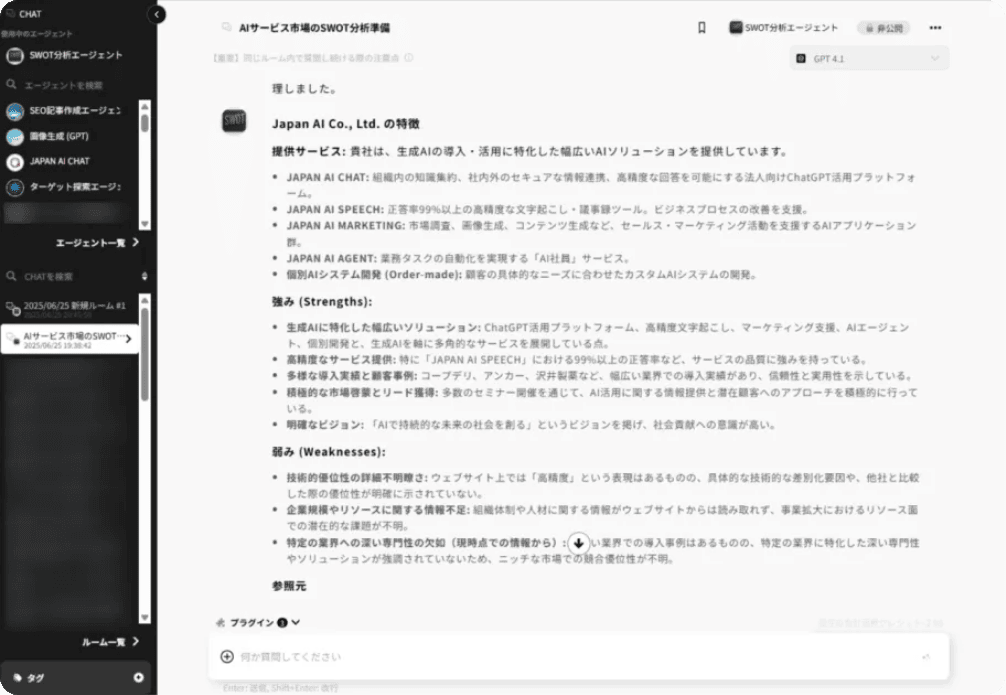「今日の日付」と「自社サービスのURL」、「調査したい市場」、をchatに入力して送信すると、SWOT分析を行ってくれます。また、想定する競合を何社か提示すると、その企業の情報を優先で取得します。