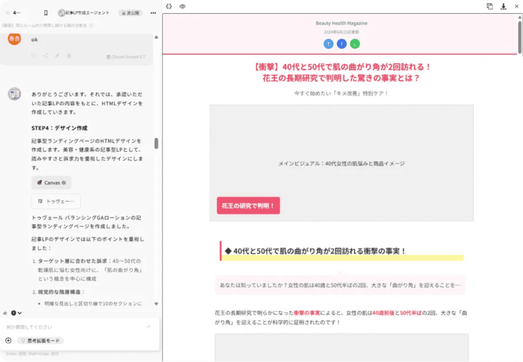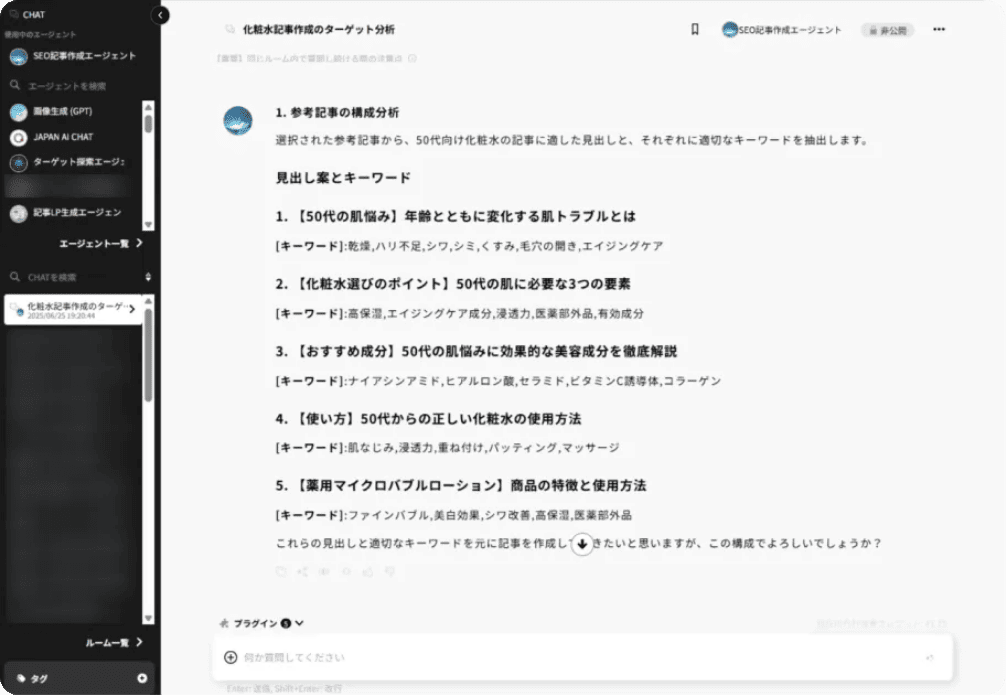 商品・ターゲットに合わせたリサーチを行い、記事の切り口を提案します。その後、記事生成→デザイン生成まで行うことができます。