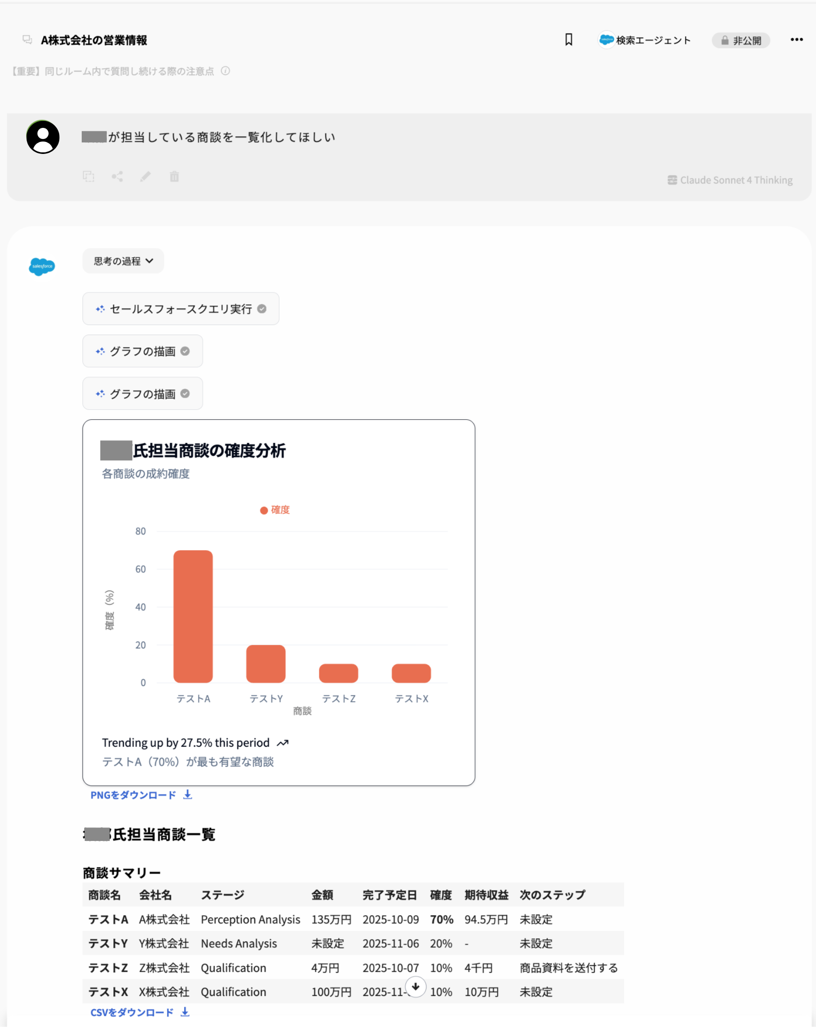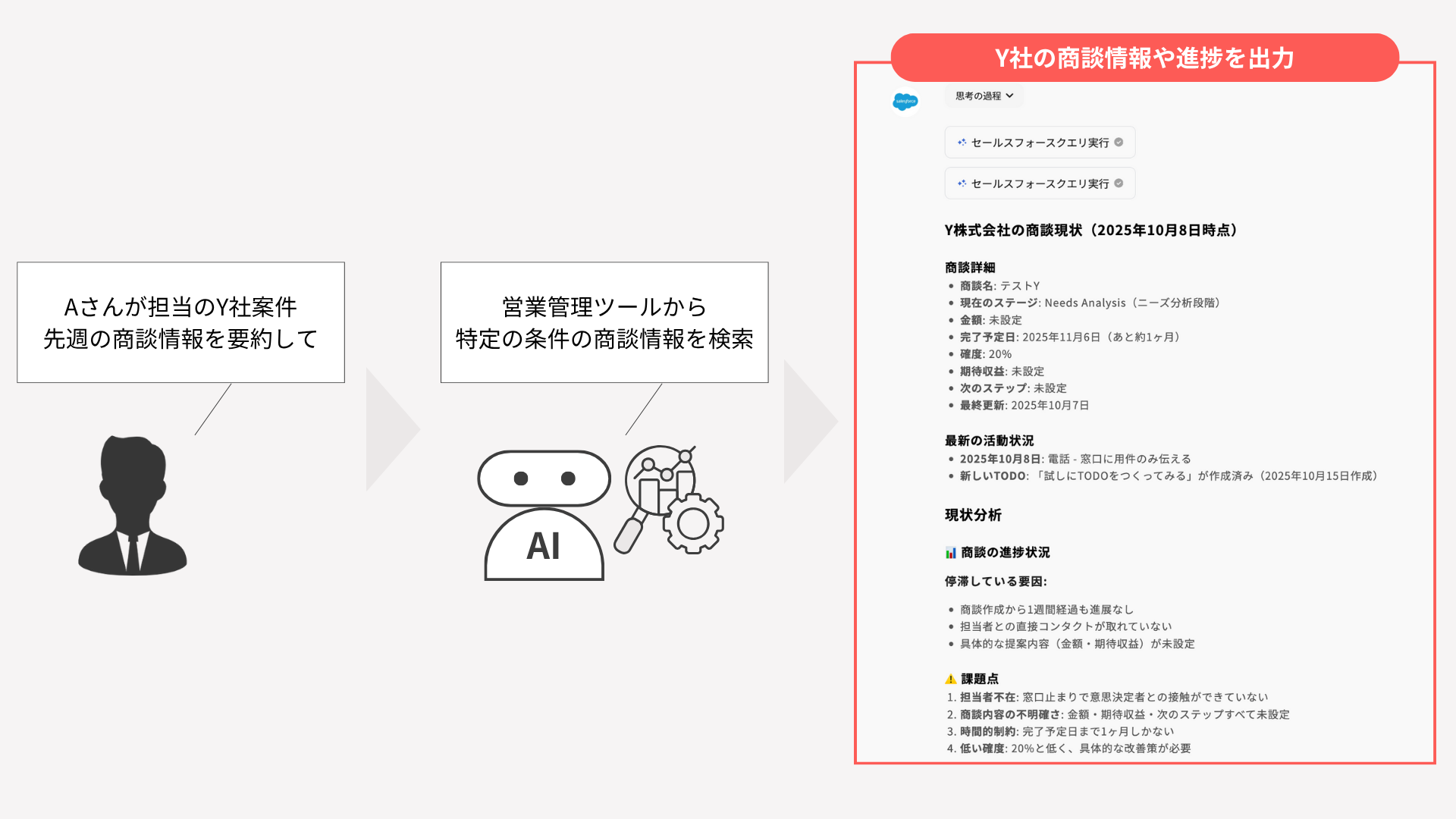 営業管理システム上の商談・活動データをAIエージェントが横断理解し、ユーザーが知りたい視点(案件進捗・停滞理由など)で回答します。自然言語で質問するだけで、必要情報を要約・分析して営業活動を支援し、現場の判断スピードとマネジメントの可視化を加速します。