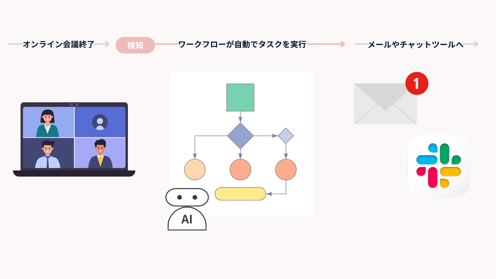 オンライン会議終了を検知し、事前に設定されたワークフローを実行する仕組みです。