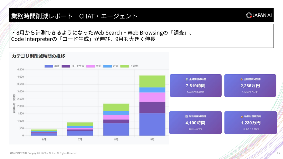 2025年6月から9月の4ヶ月間で累計7,619時間の業務時間削減を実現しました。情報検索、コーディング作業、資料作成などで全社の業務効率が大きく向上し、専門業務の属人化が緩和され、システム本部を中心に標準化が推進されました。