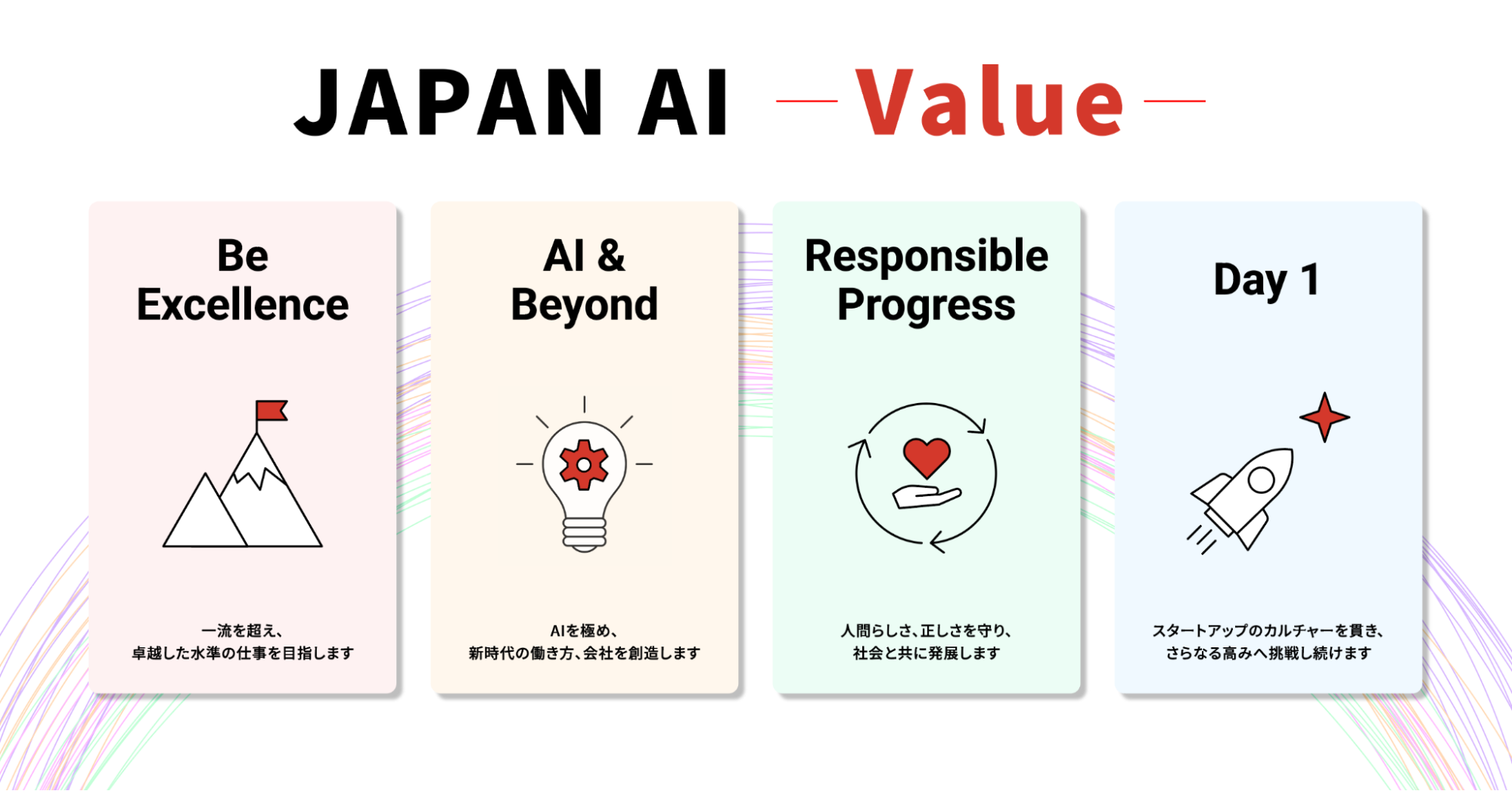 JAPAN AIでは、卓越性を追求し高い基準で仕事に取り組むこと、AI技術を活用しながらその先の価値を創造すること、社会的責任を果たしながら進歩を続けること、常に初日の気持ちで挑戦し続けることを、全従業員が日々の業務の中で実践しています。
