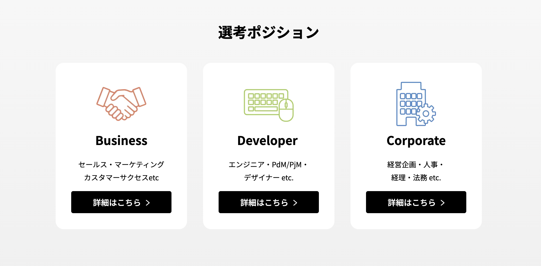 ビジネス、エンジニア、コーポレートなど、各職種の詳細情報を掲載しています。