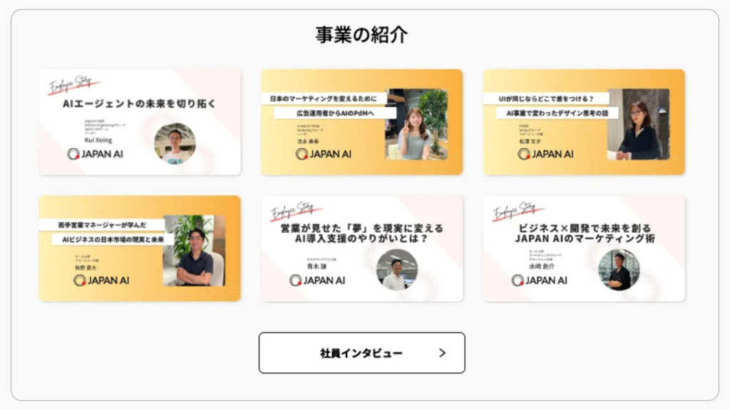 採用サイトでは、これらの価値観を体現する社員の声や働く環境を紹介し、求職者がJAPAN AIでのキャリアを具体的にイメージできる内容となっています。